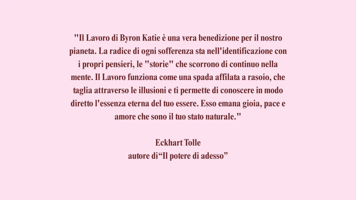 Il Lavoro di Byron Katie è un modo di identificare e di indagare i pensieri che causano tutta la sofferenza del mondo. È un modo di trovare pace in se stessi e nel mondo. Chiunque abbia una mente aperta può fare Il Lavoro.
