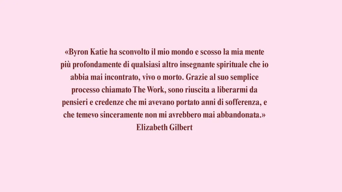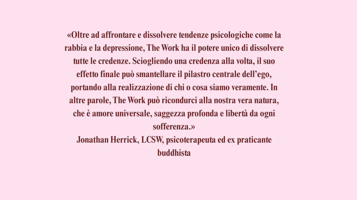 In un lampo d’intuizione vide che il nostro tentativo di trovare la felicità procedeva al contrario: invece di cercare disperatamente di cambiare il mondo per adeguarlo ai nostri pensieri su come “dovrebbe” essere, possiamo esaminare questi pensieri e, accogliendo la realtà per com’è, fare esperienza di gioia e libertà inimmaginabili.